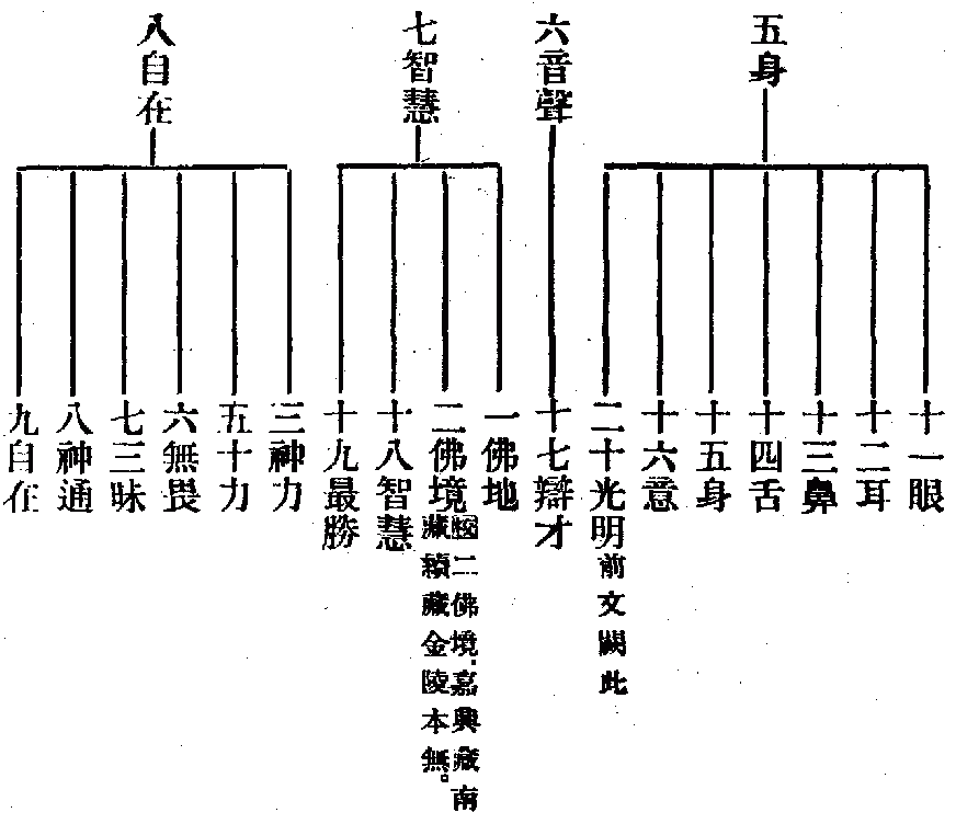 【疏】初一總明自在。兼攝加持。初總可知。別中。全同八地之中十種自在。但深廣不次耳。一法自在。論經云。無中邊法門示現故。二心自在。無量阿僧祇劫三昧入智故。由在三昧觀機.故化不失時。三勝解自在。大小淨穢.隨解轉變故。四財自在。一切世界無量莊嚴.嚴飾住持故。五命自在。不可說劫命住持故。六如意自在。一切國土中如意變化故。七智自在。如來力無畏不共法相好莊嚴.三菩提示現故。文中生界無邊。機熟相續。故念念應成。而真成在昔故。佛於三世。非是新覺。亦非不覺.住在學地。又顯雖念念覺.離覺相故。非三世覺。亦離不覺。故不住學地。又云。而悉通達無量智等。即十力等。八業自在。六根互用.廣大佛事.是佛業故。然非改轉。一根不變.本來具故。九生自在。一切世界生示現故。十願自在。隨心所欲佛國土時.示成三菩提故。上來唯三與八。取意而釋。餘並論經之文。其第十自在。文有四節。一一念現多佛.於一類界成佛。二如於眾妙下。類顯餘界。三如於一念下。類顯餘念。四一念一切現下。總結深廣。一切現者。一念便現法界諸形諸時諸神力故。一念無量住者。常無現故。而不動如來少許方便。故云自在。