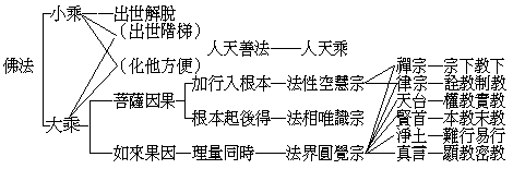 古今諸德判釋如來一代時教,或一或二,或五或十,種種數目不一而足;今總括之分為大小二乘與人天乘。而此人天乘法,全係大小乘之出世階梯,或大小乘之化他方便;故佛法之根本唯大小乘。其大小乘法修證法門之次序,與對於各宗之關係,極其縝密,試皆表列於左: