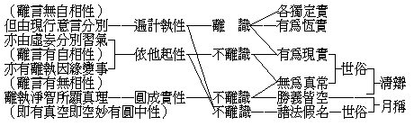 這兩派的思想,在言詮上看,勝義諦上雖同說皆空,而世俗諦上則清辨謂實有自性,月稱說假無自性,很不相同。然若仔細考究其含義,月稱雖說世俗諸法皆是假名無自性,然在假名中並不否認世出世間的業果染淨諸法,不但不否認,而且以有空義故,才能成立四諦三寶等諸緣起法。緣起的三寶、四諦諸法,固然都是假名空無自性的,但說為假名並不是撥無染淨善惡因果差別的成立。在這意義上說,清辨所說之有,也就是因緣生起的緣起有。這緣起有,一面是無自性故空;一面是因緣生故有。由是考究,世俗諦上月稱所說的假名,與清辨說的實有,不過名詞上的差別而已。考其含義,月稱的假名,既不曾撥無染淨因果,不但與清辨所說的俗有一樣,甚或進一步可與小乘一切有部所說的「有」相接近。所以現在西藏黃教的所宗固為月稱空義,但他們所用以說明世出世間的假名諸法,反而是引用俱舍論。所以、名句的應用雖有巧拙不同而意趣並非甚遠。總之、空宗的要義,諸法皆緣起無自性。在二諦上說,勝義都是空無自性,世俗則或說但是假名,或說可有自性。