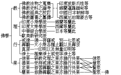 觀右表所列,可知學佛,教理行果為應有之程序,非可躐等。今世學人,大多昧教理而妄談行證,不為邪魔所誘,即同生盲摸象,反使真理愈晦,招世人譏謗為迷信,幸各努力,剪除斯弊!