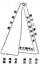 般若心云:菩薩依般若——即二空觀——故究竟涅槃;諸佛依般若故得阿耨多羅三藐三菩提——即事事無礙法界——;亦明斯義。此圖曲線表雜染生死法,直線表清淨常住法。生死故、流轉業繫苦海中,旅進旅退,飄泊無歸。常住故、超出苦海流轉——苦海流轉即世間義及生死義——外,隨緣任運,應現自在。而世間雖有種種政治革命、宗教革命、產業革命等,以求之惑業苦中故,無二空觀之澈底革命,故仍墮循環之因。故修學大乘者,必有二空觀之革命精神以貫澈之,不能茍安圖便,妄想從眾生界橫達佛界。從眾生界橫達佛界,則相似佛界之事事無礙,仍等於眾生界之汎神教耳。學華嚴真言者,未經過二空之澈底革命,亦不能達真實之事事無礙界。故華嚴須由理法界觀——即二空觀——經理事無礙法界觀,然後事事無礙。真言亦須以阿——即本空義——字為根本觀也。然大乘革命之進行果如何耶?茲分數章述之。