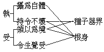 不可知者,謂此識所緣之五淨色根,及諸種子甚微細;又所緣之外器世間,廣難測量。而其能緣行相,亦極幽妙。執受處,此為所緣境。第八識有三種境界,即根身、器界、種子。而根身與種子為其執受,器界即處。又執受各有二義:——