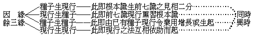 問:若無外緣內心不起,內心不起業無自生,何以世間有情生死相續?答:有情生死相續,皆由內之因緣。諸業,謂福業——自體及果俱可愛樂,相殊勝故;非福業——自體及果俱不可愛樂,相鄙劣故;不動業——具業多少,住一境性不移動故,習氣,謂熏習——亦即結習,即種子——氣分。二取習氣,即指我執取、名言取。此二取,俱有執著義。計有四種:一、取相分見分,二、取五蘊名色,三、取心及心所,四、取本末,本即第八識總報,末即前七識別報。彼四種所取,皆是我執名言二取所攝。又諸業習氣內,具有二取習氣。二取習氣,有如灰土;諸業習氣,有如泥團。泥團能攝灰土,諸業習氣亦攝二取習氣。即分散為二取,和合為諸業。俱,謂業種與二取種俱,是親疏緣互相助義。前異熟,謂前一生乃至前百千生,業力所感之異熟果。餘異熟,謂感後一生乃至感後百千生業力之異熟果。蓋三界內分段生死,由有漏善與不善之業種子為因,煩惱障種以為助緣,招於六道身命麤異熟果,前盡後生。即三界外不思議變異生死,亦由無漏有分別業種子為因,所知障種以為助緣,感於三種意生身細異熟果,前後改轉。是則二種生死,皆由內識惑業所感,固無藉乎外緣也。