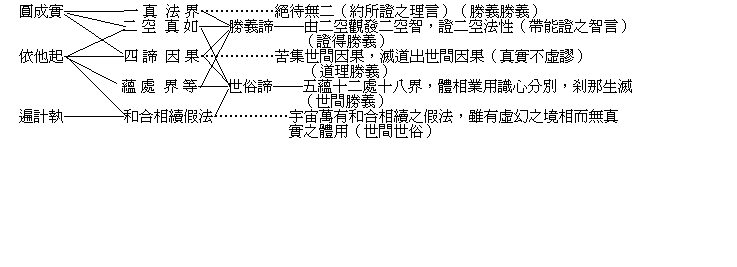 問:若唯有識,經不應說有三性!答:言三性者,亦不離識。三性即下言遍計執性,依他起性及圓成實性也。彼彼、猶言種種,遍、周遍,計、計度。即依見相二分,加以刻畫計度,宇宙萬有由此而著。此妄執自性差別,名為遍計所執自性,如是自性,空無所有。又、遍計執性,或言:八識皆有,因八識皆具見相二分,而此遍計執性即為於見相二分上有分別故。然第八識及前五識,非能遍計。或謂:惟六識有遍計執。然執性畢竟起自末那,故護法言:遍計執性,唯於第六第七心品有之。蓋見相二分是依他而起,由依他起性虛妄執著,即為遍計執性矣。如黑夜見樹,執以為鬼,畢竟非有。他、指眾緣,依他、言仗因託緣,如眼識九緣生,耳識八緣生等。分別、言明了分別之識。生、即眾緣之集現。謂此心心所法及見相分有漏無漏,皆依眾緣而生起,悉由識心分別而顯現。如黑夜見樹,形相實有。圓、謂圓滿,成、謂成就,實、謂真實。彼、指依他起性。前性、指遍計執性。言此圓滿成就真實之法,體非虛妄,即於彼依他起性上常遠離遍計性。如枯樹非鬼,鬼無樹有。