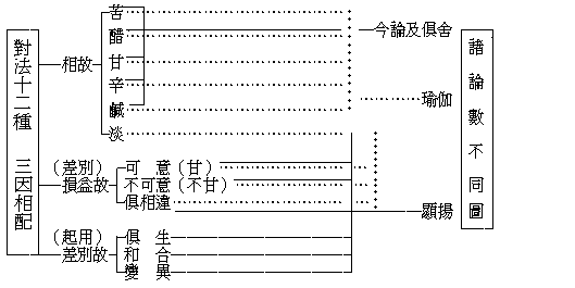 此舌根所對,舌識所緣之境也。味、即所噉,是可嘗義——通常為滋味。有此甘等六味,是味之差別。然通俗只有五種,彼將淡攝甘味中,以甘淡不異故;若仔細審察,甘是甜味,淡是淡白故。瑜伽加可意、不可意、俱非為九種。對法又加俱生、和合、變異,列十二種。顯揚有可、不可、俱非,並俱生等合六,以辨苦醋等六味體相之損益——可意等三損益差別,差別——俱生等三起用差別。如是若約境,應有十二細分;約情以談,則甘味為瑜伽顯揚之可意,及對法顯揚之變異所收,淡味為瑜伽顯揚之俱非所收;於此益見世法與佛法之淺深精粗者矣。