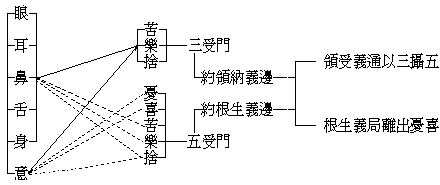 綜上所說,受有苦、樂、捨之三受,或加憂、喜之五受。有通六識有者,有局前五者,乃至七八二識等之種種差別。若克論之,一切有漏位中,所有三界二十五有,無一非苦,奚喜樂等之有哉!所以者何?是有漏受心故;若三受者,樂滅時是壞苦,苦生時是苦苦,捨受非苦樂,剎那有生滅,即是行苦。又樂受於未得希得,希得不遂,求不得苦;已得復失,得不永得,愛別離苦。復次、苦生時為生苦,乖離不能怨會苦,苦之不盡陰盛苦。三受既爾,五受准知。若佛果無漏受心則不然,樂則常樂,捨受平等,寂然無苦之發生矣。