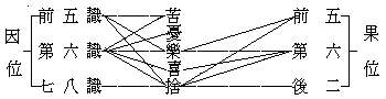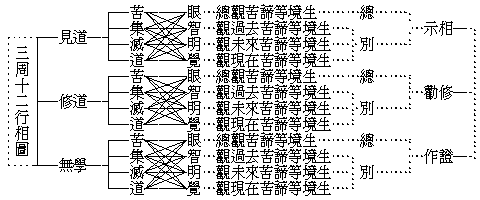 ┌─苦法智忍────眼─┐ ├─苦 法 智────智 │ ┌─苦─┼─苦類智忍────明 │ │ └─苦 類 智────覺 │ │ ┌─集法智忍────眼 │ │ ├─集 法 智────智 │ ├─集─┼─集類智忍────明 │ ┌─見道─┤ └─集 類 智────覺 │ │ │ ┌─滅法智忍────眼 ├─示相──┐ │ │ ├─滅 法 智────智 │ │ │ ├─滅─┼─滅類智忍────明 │ │ │ │ └─滅 類 智────覺 │ │ │ │ ┌─道法智忍────眼 │ │ │ │ ├─道 法 智────智 │ │ │ └─道─┼─道類智忍────明 │ │ │ └─道 類 智────覺─┘ │ ├─修 道──────同 見 道────勸修──────┤ └─無學道──────同 見 道────作證──────┘