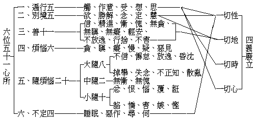 此中自有六節:第一、五是遍行者,於前總舉門中依別蘊義除受、想二,今此顯類同言此五,故曰五是遍行。遍周遍義,行起行義,此五無論何時何處何心何性均能等起,故曰遍行。由是一切心所雖有性用各異以顯差別,而大類之攸分,猶在斯四義矣。故瑜伽以此四義——時、處、心、性——廢立心所差別曰:一者、善等三性遍不遍,二者、三界、九地遍不遍,三者、剎那相續,四者、彼此同時俱起不俱起。就此四義,或有具二,或有具三,或四咸具,遂有別境善等六種之差別耳。第二、五是別境者,謂所緣境事多少不同,能緣心性乃起自所緣特別之境,故名別境。詳言之,於境不遍,闕剎那相續、俱起之二,各各別緣其境以生心也。五者、欲、勝解、念、定、慧也。是者、體聲,即指五法之自體。第三、十一是善者,明善心所類也,即信等十一數是。所言善者,二世順益故。此十一自體即善,唯善心所可得生故,是以總束稱善也。又此中、於四一切,唯具遍一切地之一種,不具餘三可知。第四、六是煩惱者,總束貪、瞋、癡等六法也。若別開之,則有十法。後作釋中開五見,一一有釋,至下當知。此六法為惑之根本,餘惑皆此等流、分位差別,故名本惑,是為根本煩惱。煩性即惱,持業釋也。第五、餘是隨煩惱者,明大中小之隨煩惱也。餘者、本惑六法之餘,即指忿恨等二十法故。若依瑜伽則有二十二法,更加邪欲、邪勝解故。此二十惑,皆本惑等流性,隨彼生故,稱隨簡本,能隨所隨異故。煩惱之隨,依主釋。若以隨煩惱三字為自名,他一分有財亦得,亦稱隨惑對本惑故。是此本隨二惑,於四一切皆不具,不通三性,不遍九地,非相續,亦不俱起故。第六、四不定者,惡作等四法也。對法疏舉三因以明不定義:謂此四於善染等三性皆不定故,非如觸、作意等定遍心故,非如欲等定遍地故,立不定名。又釋論解此及簡別曰:『此四不定,非正隨煩惱,以通善及無記性故』。瑜伽抉擇分合六位為五位,即不定四攝隨惑中。蓋彼論意,謂此四法雖通三性,於中染義增故,依之攝隨惑中,六位而為五位也。今安慧論師通之言「非正隨煩惱」,非正言,顯一分通染性義也。『以通善及無記性故』下,述所由,通三性故。此不定於四一切中,惟有一切性之一種,無餘三可識。