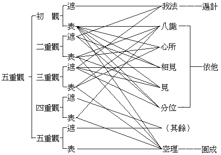 ┌有──我法─┬──遣─┬───空 觀 │ \ / └遍計──┘┌──┘ 遣虛存實┤ ╳ ┌依他──┬┼──中道觀 │ / \ ├圓成──┤└──┐ └空──事理─┴──存─┴───有 觀