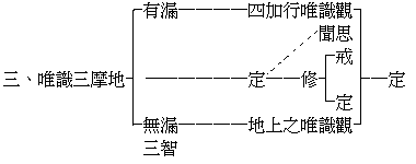 明地上地起也。見道者初地,金剛定者十地後心。此二皆依色界第四靜慮以起唯識現觀。言金剛者,喻也,此定所發智如金剛,能摧一切二障種現,而不為一切障所破。喻如金剛諸物中堅,能破一切,而不為他物所破也。金剛定者,定相應慧,亦云金剛道、金剛智。後通諸地者,後謂見道之後修習位中,通于諸地,隨應起觀。諸地者,色界六地:一、初禪有尋有伺未至地,二、無尋唯伺初禪地,三、無尋無伺由初禪至二禪中間地,四、二禪定,五、三禪定,六、四禪定。無色四者:謂空無邊定,識無邊定,無所有處定,非想非非想定。足前成十。此觀斷惑九者,謂依此諸地修唯識觀,能斷惑者唯有九地,除去非想非非想定,少有慧故。然遊觀者通于十地。無漏聞、思隨依無爽者,見道之後所有聞、思,純是無漏,隨所依諸地而起,無有爽礙。上七未至者,謂未至定共有八種,初初禪未至定可以依修,上七未至定則不能依修。何以故?以唯有欣厭故,行相局故。