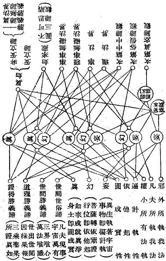 ┌堅濕(即諸原質)煖動(即諸原力)空(即是宇宙具遍常義) ┌─┤ 即於 │ └地水火風時(時即世界、此五即上五之現相、亦是動植諸物之本相總相。) 一人 人┤ 完全 │ ┌思想名言行 具足 ├─┤ │ └善惡功罪事 │ ┌見聞覺知心 └─┤ └眼耳鼻舌身 ┌法性真如┐ ┌─┤ ├迷悟依……─天台理具三千、是約此立、故云性善性惡 即於 │ └染淨性德┘ 一心 心┤ ┌聞思修種┐ 完全 ├─┤ ├染淨依 具足 │ └漏無漏業┘ │ ┌眾生心體┐ └─┤ ├真妄依 └聖凡法界┘