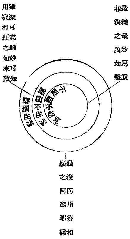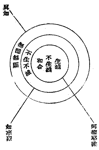 外延以真如為最廣,內容以阿黎耶識為最深。就大乘以辨之:則真如、為大乘非大乘之通體,如來藏、為大乘之自體相,阿黎耶識、則為大乘自體相用。從另一式觀之,又可為圖如下: