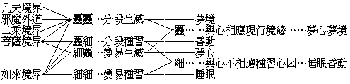 此中境界之義,是所了知之境之義。所了知之境,即是所解脫超出之境。如來究竟解脫超出乎睡眠之夢本,故能究竟了知睡眠為夢之本。離睡眠後,非無吾心自真體相。而離吾心,則無睡眠法之自體,睡眠且無,依睡眠所起之昏夢心境,本空可知。而凡夫者但知著夢境為實有,要夢境之常有、種種愛取。二乘者但知夢境之可滅,要夢境之速滅、種種解脫。更有不得其方法者,要有要滅,於中妄作功用而成種種邪魔外道;若中國屬於道教之各派,及印度彌曼差、數論、勝論、瑜伽等是也。菩薩乃知此夢境者,皆由夢心昏動而現,故知一切夢境唯心;亦能分知夢心昏動由於睡眠而起。但因未得全醒故,猶不得完全切實了知離卻睡眠之吾心真實耳。