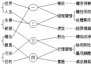 釋 一、普為世界悉檀:隨俗常化義,適應一時、一地眾同分心理義,使陷溺習俗者咸得驚醒義,使聞見歡喜者發生信心義,為說世界正因緣義。二、各為人生悉檀:隨機異說義,引發各人各種不同類善根義,使隨其所處之地位各成進修義,使信解修行者增長福德義,為說人生正因緣義。三、藥病對治悉檀:破惡義,遠離世間義,斷除煩惱義,止息分別義。四、顯第一義悉檀:入理義,契證法性義,成就菩提義,圓滿寂靜義。