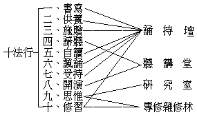 ┌───┬─────┬──┬───┬──┬───┬──┬───┬──┐ │半月半│誦 持 壇│每日│聽講堂│每日│研究室│每日│博覽部│每日│ │月誦戒│ │三時│ │二時│ │三時│ │二時│ ├───┼─────┴──┼───┴──┼───┴──┼───┴──┤ │誦 經│般若經全(一年)│︵︵掌珍論 │掌珍論及疏 │大乘四論玄義│ ├───┴────────┤握聽十二門論│十二門論及疏│ 大乘義章 │ │正行─趺坐恭誦─每日二時│其︶掌珍論疏│十二門論宗致│二諦章 五十│ │ ┌一 禮拜┐ │宗︵三論玄義│義記 │問答 三論遊│ │ │二 稱讚│ │要參十二門論│肇論及諸疏 │意 法華論疏│ │加行┤三 供養├每日半時│︶閱疏聽講錄│法性宗明綱論│ 法華經遊意│ │ │四 發願│ │ ︶(半年)│(半年) │ 三論略章 │ │ │五 懺悔┘ │ │ │大乘玄論 維│ │ └六 書寫─每日半時│ │ │摩經注 起信│ │ │ │ │論慧遠疏 │ │ │ │ │華嚴、維摩、│ │ │ │ │勝鬘、金光明│ │ │ │ │、無量壽、彌│ │ │ │ │勒、大般若、│ │ │ │ │金剛、仁王、│ │ │ │ │法華、涅槃諸│ │ │ │ │經,關於吉藏│ │ │ │ │、慧遠之玄疏│ │ │ │ │。 │ │ │ │ │(半年) │ ├──┬─────────┼──────┼──────┼──────┤ │誦法│大寶積經 │︵︵ │中論青目釋 │天台宗、禪宗│ │加行│大集經 │究聽中論青目│大乘中觀論釋│、華嚴宗、律│ │如前│勝鬘 楞伽 密嚴 │其︶釋 │中論嘉祥疏 │宗、淨土宗、│ │ │淨土 金光明 維摩│精︵般若燈論│十八空論 │東密、藏密宗│ │ │詰等諸方等經 │微參釋 │大乘破有論 │各主要著述。│ │ │(一年) │︶閱大乘中觀│(一年) │無著、天親關│ │ │ │ ︶論釋 │ │於金剛及般若│ │ │ │ 中論嘉祥│ │諸論。 │ │ │ │ 疏 │ │文殊師利問菩│ │ │ │ (一年)│ │提經 聖佛母│ │ │ │ │ │般若波羅密多│ │ │ │ │ │九頌精義論 │ │ │ │ │ │佛母般若波羅│ │ │ │ │ │密多圓集要義│ │ │ │ │ │論 破取著不│ │ │ │ │ │壞假名論 │ │ │ │ │ │(一年) │ ├──┼─────────┼──────┼──────┼──────┤ │同 │法華經 │︵︵ │大智度論 │阿毘達磨集論│ │ │華嚴經 │極聽大智度論│菩提資糧論 │瑜伽師地論及│ │前 │涅槃經 │其︶ │十住毘婆沙論│記 │ │ │大日經等 │廣︵十住毘婆│壹輸盧迦論 │辨中邊論 攝│ │ │(半年) │大參沙論 │菩提行經 │論無著世親釋│ │ │ │︶閱菩提資糧│六十頌如理論│成唯識論及記│ │ │ │ ︶論釋 │大乘二十論 │佛性論 │ │ │ │ (一年)│(一年) │佛地經論 │ │ │ │ │ │十地經論及義│ │ │ │ │ │記 │ │ │ │ │ │(一年) │ ├──┼─────────┼──────┼──────┼──────┤ │同 │四阿含律藏 │︵︵ │百論及疏 廣│因明論及疏 │ │ │(半年) │巧聽百論婆藪│百論 百字論│佛教歷史 │ │前 │ │其︶釋 │大丈夫論 破│印度外道 │ │ │ │應︵廣百論及│外道小乘四宗│中國哲學 │ │ │ │用參釋 │論 楞伽破小│西洋哲學 │ │ │ │︶閱百論疏 │乘外道涅槃論│科學大綱 │ │ │ │ ︶(半年)│方便心論 迴│各教大綱 │ │ │ │ │諍論 成實論│世界史綱 │ │ │ │ │俱舍論 宗輪│法性宗文學 │ │ │ │ │論及記 龍樹│(半年) │ │ │ │ │菩薩傳 提婆│ │ │ │ │ │菩薩傳 │ │ │ │ │ │(半年) │ │ └──┴─────────┴──────┴──────┴──────┘