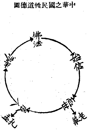 觀此中華之國民性道德圖,則可知今日欲求中華國民性之道德,必始乎佛法,終乎佛法,捨佛法莫為功也!誠能發揮光大,篤行實踐乎此者,則如病危之際,真元恢復;然後固之以軍警,理之以法政,培之以教育,資之以實業,調而養之,可臻健康。
