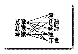 ┌──明 ┌───眼───┐ ├──空 ├───耳───┤ ├──色 慮├───鼻───┤ ├──眼根 知┼───舌───┼識 眼識┼──意 心├───身───┤ ├──我 ├───意───┤ ├──藏 ├───我───┤ ├──種 └───藏───┘ └──作意(動)