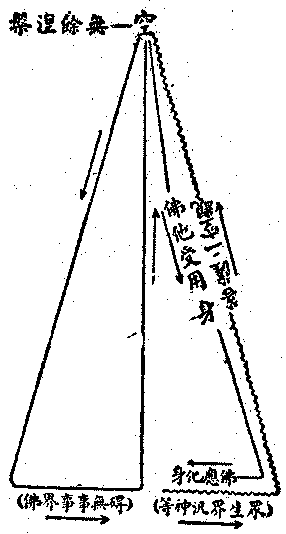 般若心經云:菩薩依般若——即二空觀——故,究竟涅槃;諸佛依般若故,得阿耨多羅三藐三菩提——即事事無礙法界——,亦明斯義。此圖曲線表雜染生死法,直線表清淨常住法。故修學大乘者,必以二空觀之革命貫澈之,不能茍安圖便,妄想從眾生界橫達佛界之事事無礙;以未經二空觀之澈底空淨,終等于汎神耳。學華嚴、真言者,未經過二空之澈底革命,亦不能達真實之事事無礙界。故華嚴須由理法界觀——即二空觀——經理事無礙法界觀,然後事事無礙;真言亦須阿——即本空義——字為根本觀也。